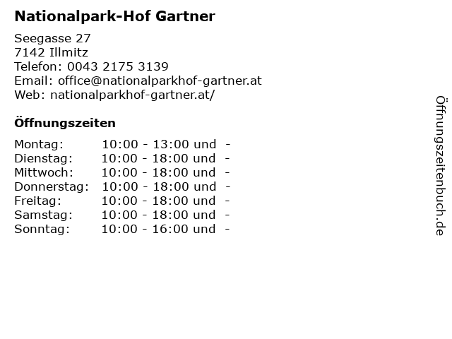 | Öffnungszeiten Nationalpark-Hof Gartner in Illmitz anzeigen | |