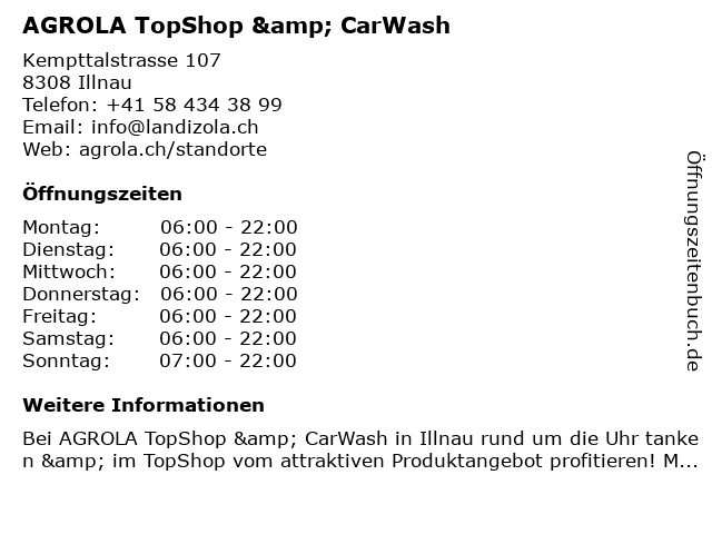| Öffnungszeiten AGROLA TopShop & CarWash in Illnau anzeigen | |