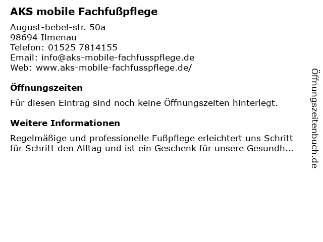 | Öffnungszeiten AKS mobile Fachfußpflege in Ilmenau anzeigen | |