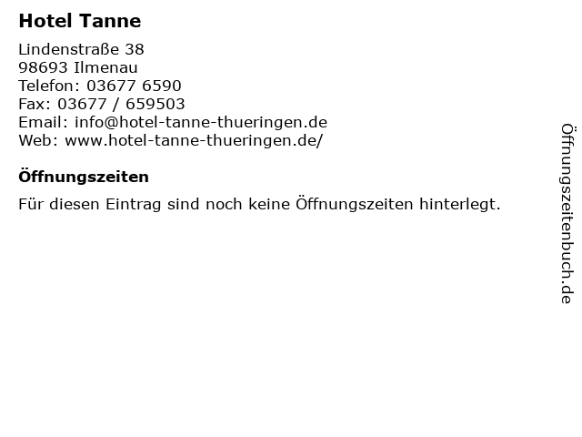 | Öffnungszeiten Hotel Tanne in Ilmenau anzeigen | |