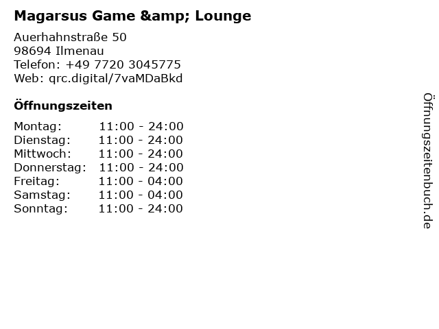 | Öffnungszeiten Magarsus Game & Lounge in Ilmenau anzeigen | |