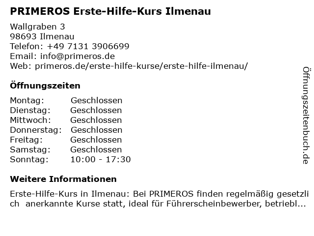 2 Erste Hilfe Kurs in Ilmenau bei der Sanitätsschule Huber (Entfernung: 0,01 km) Wallgraben 3, 98693 Ilmenau 4 Erste Hilfe Kurs in Arnstadt bei der Sanitätsschule Huber (Entfernung: 15,74 km) Brauhausgasse 1-3, 99310 Arnstadt 6 |