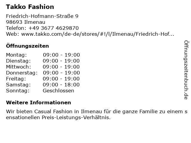 | Öffnungszeiten Takko Fashion in Ilmenau anzeigen | |