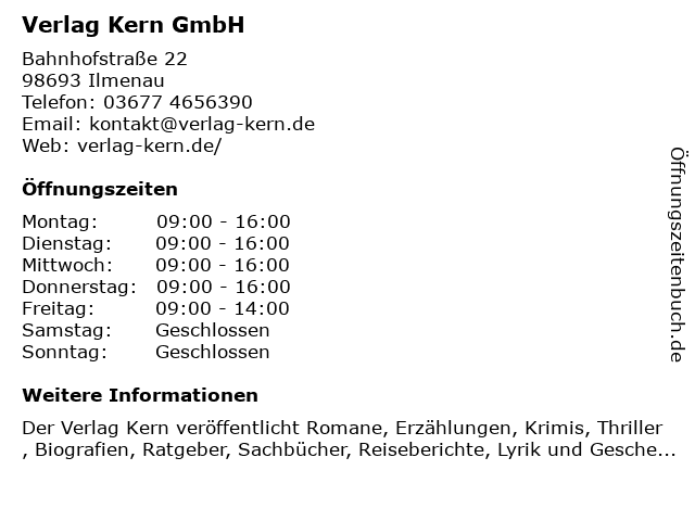 | Öffnungszeiten Verlag Kern GmbH in Ilmenau anzeigen | |