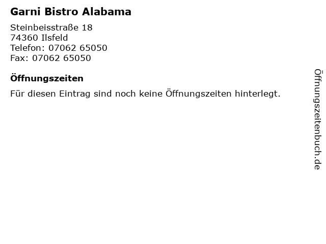 | Öffnungszeiten Garni Bistro Alabama in Ilsfeld anzeigen | |