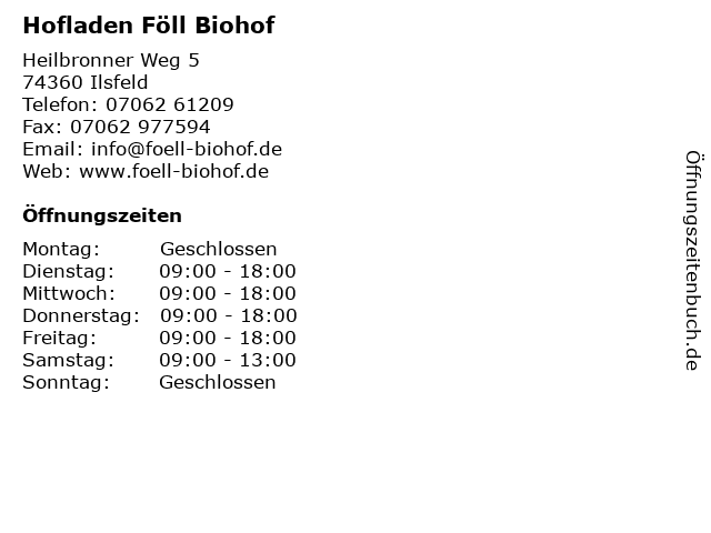 | Öffnungszeiten Hofladen Föll Biohof in Ilsfeld anzeigen | |