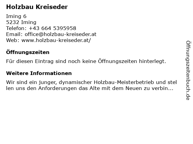 | Öffnungszeiten Holzbau Kreiseder in Iming anzeigen | |