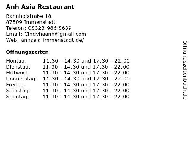 | Öffnungszeiten Anh Asia Restaurant in Immenstadt anzeigen | |