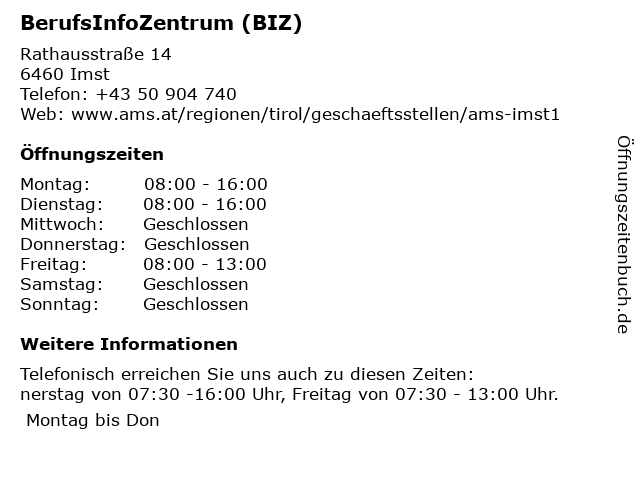 | Öffnungszeiten BerufsInfoZentrum (BIZ) in Imst anzeigen | |