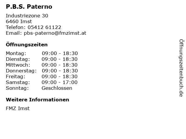 | Öffnungszeiten P.B.S. Paterno in Imst anzeigen | |