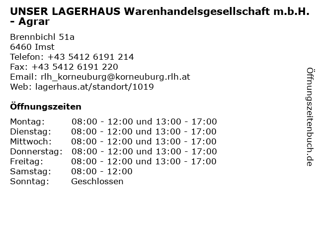1 UNSER LAGERHAUS Warenhandelsgesellschaft m.b.H. - Agrar (Entfernung: 8,51 km) Handelsweg 8, 6430 Ötztal-Bahnhof 5 UNSER LAGERHAUS Warenhandelsgesellschaft m.b.H. - Baustoffe (Entfernung: 9,23 km) Industriestraße 6, 6430 Ötztal-BHf. 6 |
