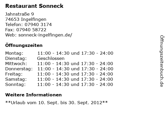 | Öffnungszeiten Restaurant Sonneck in Ingelfingen anzeigen | |
