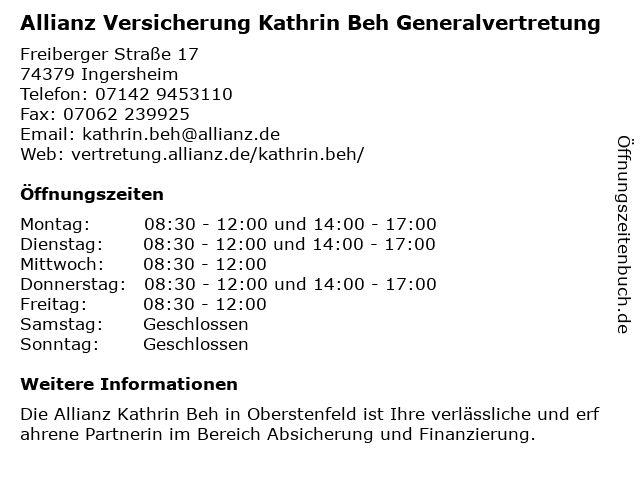1 Allianz Versicherung Axel Braun Generalvertretung (Entfernung: 0,00 km) Freiberger Straße 17, 74379 Ingersheim 2 Ruschmann Manfred Allianz Generalvertretung Versicherungsagentur (Entfernung: 3,52 km) Neue Str. 1, 74321 Bietigheim-Bissingen 4 Allianz Versicherung Jeisen Keklik Generalvertretung (Entfernung: 5,69 km) Nußackerweg 6, 71634 Ludwigsburg 6 |