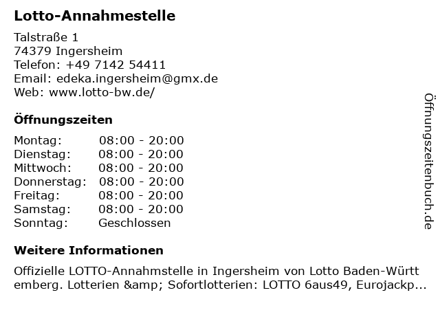 | Öffnungszeiten Lotto-Annahmestelle in Ingersheim anzeigen | |