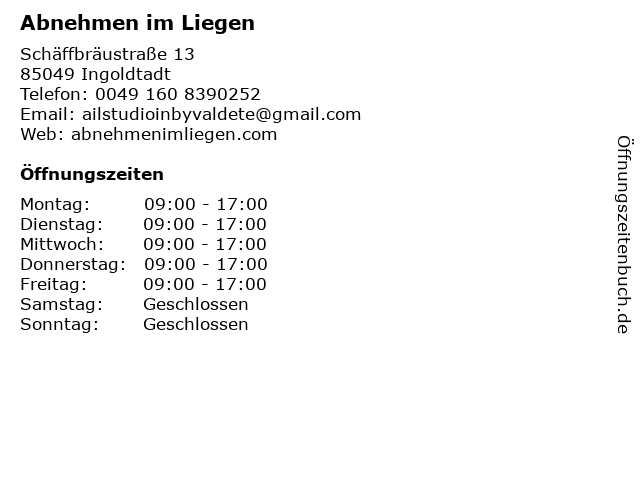 | Öffnungszeiten Abnehmen im Liegen in Ingoldtadt anzeigen | |