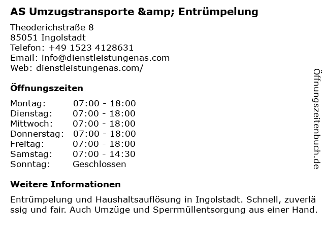 1 Umzüge Alpha Service | Umzugsunternehmen | Entrümpelung (Entfernung: 3,15 km) Georg-kneißl-str. 3, 85051 Ingolstadt 3 Marlon Flock Gebäudereinigung, Entrümpelung und Spezialdienste (Entfernung: 4,36 km) Oberbürgermeister-kroher-straße 3, 85055 Ingolstadt 6 Haushaltauflösung & Entrümpelung Ryszard Kowalik (Entfernung: 14,85 km) Stettiner Str 12, 86633 Neuburg |