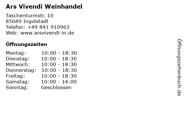 | Öffnungszeiten Ars Vivendi Weinhandel in Ingolstadt anzeigen | |
