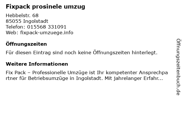 | Öffnungszeiten Fixpack prosinele umzug in Ingolstadt anzeigen | |