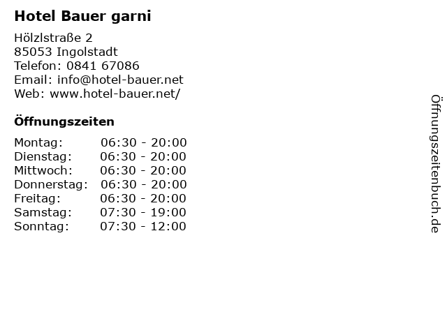 | Öffnungszeiten Hotel Bauer garni in Ingolstadt anzeigen | |