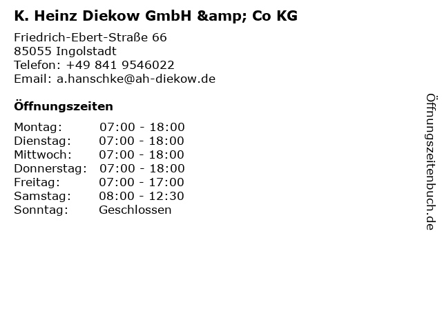 1 Karl-Heinz Diekow GmbH & Co. KG -Werkstatt/Service (Entfernung: 0,03 km) Friedrich-Ebert-Straße 66, 85055 Ingolstadt 3 Württembergische Versicherung: Karl-Heinz Feldmer (Entfernung: 5,19 km) Münchener Straße 240, 85051 Ingolstadt 5 Gemeinschaftsarztpraxis Dr med Holzer - Karl Heinz (Chirotherapie) (Entfernung: 49,91 km) Krankenhausweg 10, 85368 Moosburg 6 |