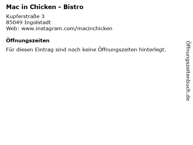 | Öffnungszeiten Mac in Chicken - Bistro in Ingolstadt anzeigen | |