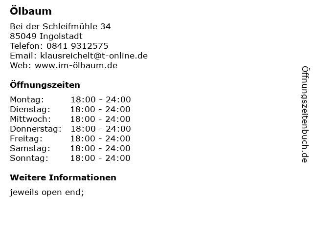 | Öffnungszeiten Ölbaum in Ingolstadt anzeigen | |