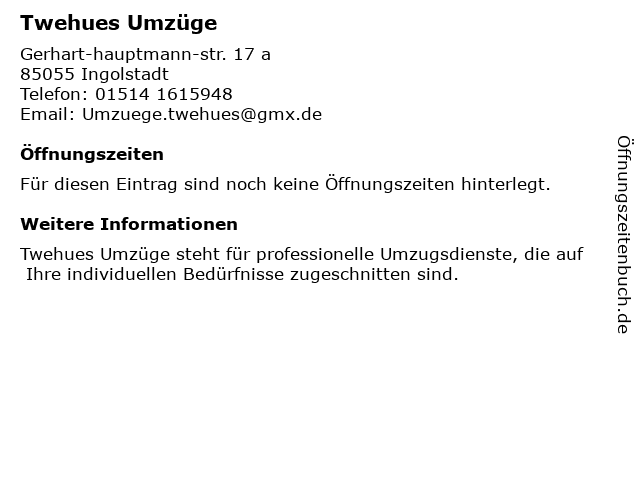 | Öffnungszeiten Twehues Umzüge in Ingolstadt anzeigen | |