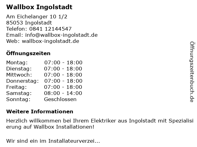 | Öffnungszeiten Wallbox Ingolstadt in Ingolstadt anzeigen | |