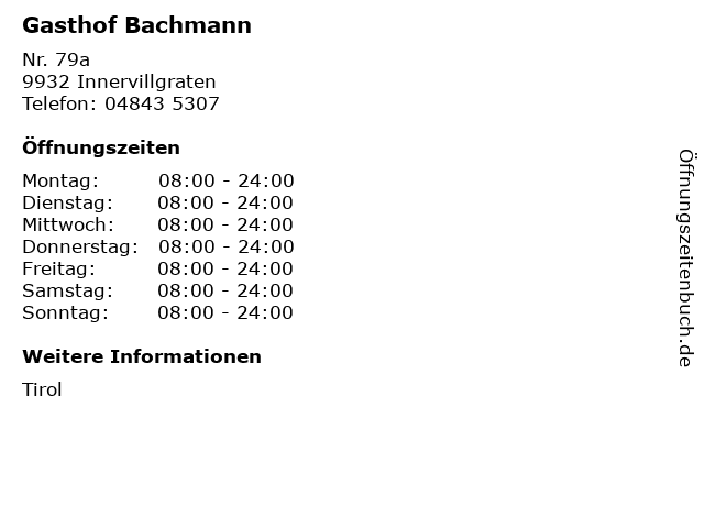 | Öffnungszeiten Gasthof Bachmann in Innervillgraten anzeigen | |