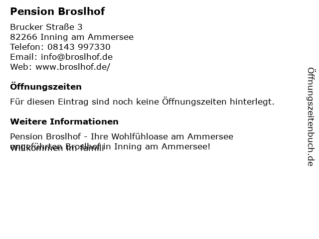 | Öffnungszeiten Pension Broslhof in Inning am Ammersee anzeigen | |