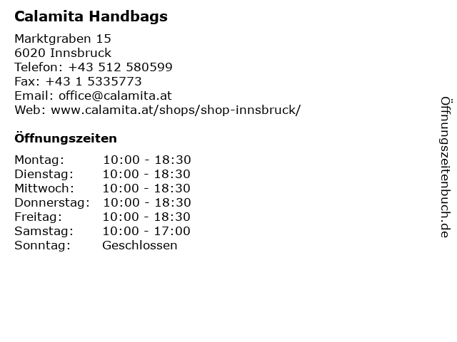 | Öffnungszeiten Calamita Handbags in Innsbruck anzeigen | |