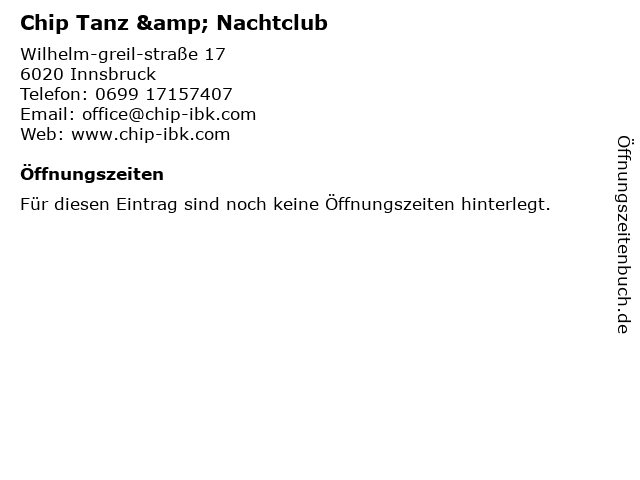 | Öffnungszeiten Chip Tanz & Nachtclub in Innsbruck anzeigen | |