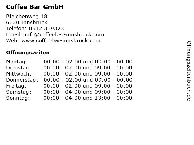| Öffnungszeiten Coffee Bar GmbH in Innsbruck anzeigen | |