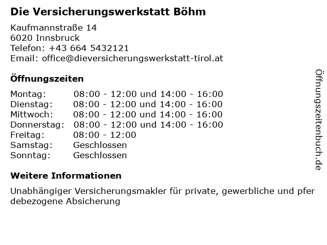 1 Helvetia - Versicherungsagentur Böhm Gabriele (Entfernung: 0,00 km) Kaufmannstraße 14, 6020 Innsbruck 6 Kanzlei Lechner Finanzierungsmakler - Versicherungsagent (Entfernung: 36,03 km) Dorf 87a, 6232 Münster |