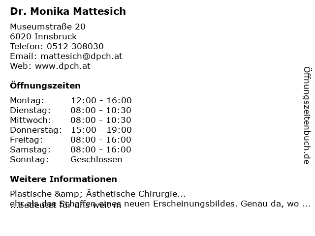 | Öffnungszeiten Dr. Monika Mattesich in Innsbruck anzeigen | |