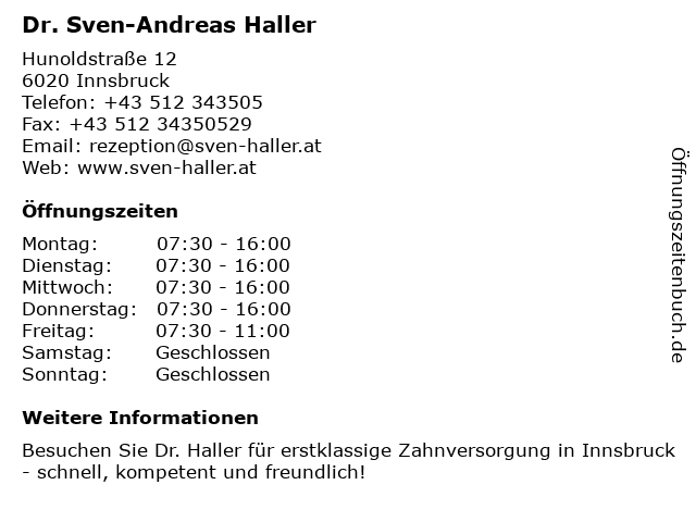 | Öffnungszeiten Dr. Sven-Andreas Haller in Innsbruck anzeigen | |
