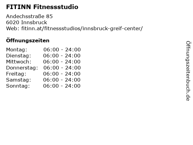 | Öffnungszeiten FITINN Fitnessstudio in Innsbruck anzeigen | |