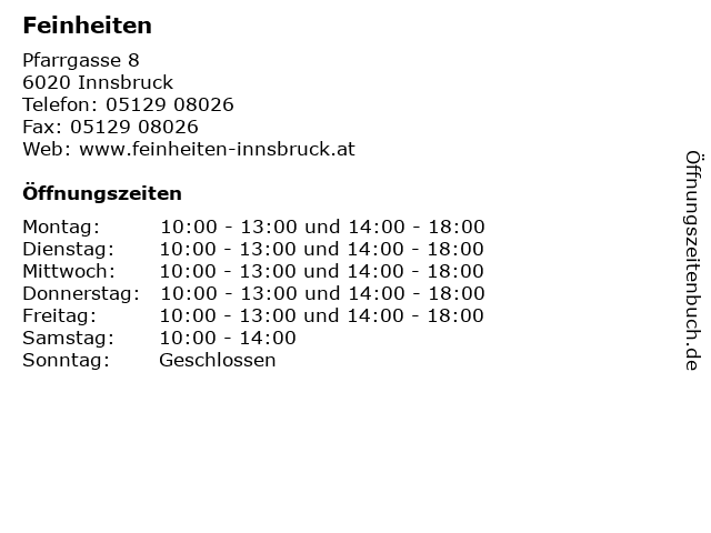 | Öffnungszeiten Feinheiten in Innsbruck anzeigen | |