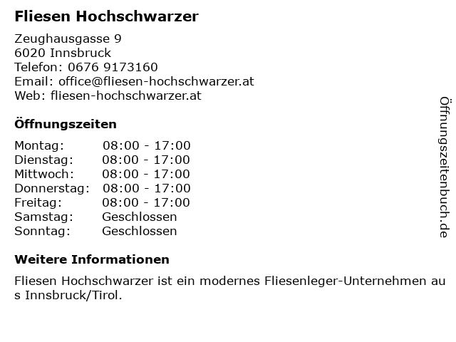 | Öffnungszeiten Fliesen Hochschwarzer in Innsbruck anzeigen | |