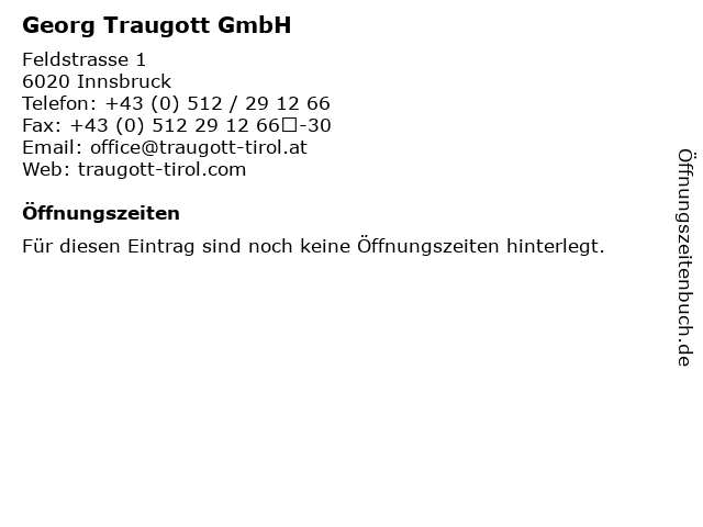 | Öffnungszeiten Georg Traugott GmbH in Innsbruck anzeigen | |