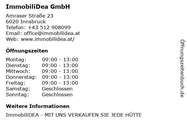 | Öffnungszeiten ImmobiliDea GmbH in Innsbruck anzeigen | |