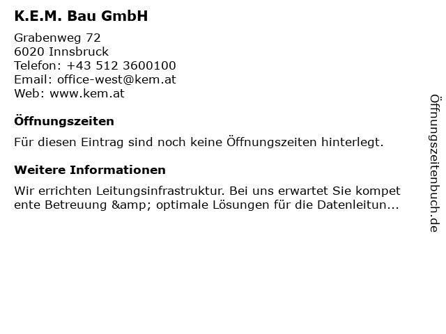 | Öffnungszeiten K.E.M. Bau GmbH in Innsbruck anzeigen | |