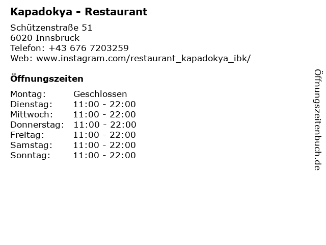 | Öffnungszeiten Kapadokya - Restaurant in Innsbruck anzeigen | |