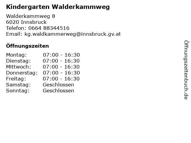 | Öffnungszeiten Kindergarten Walderkammweg in Innsbruck anzeigen | |