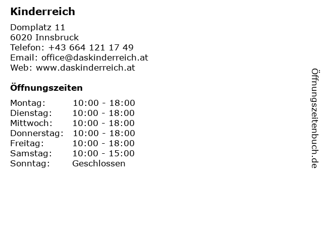 | Öffnungszeiten Kinderreich in Innsbruck anzeigen | |