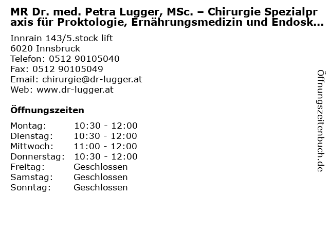 Branchen & Suchbegriffe zu MR Dr. med. Petra Lugger, MSc. – Chirurgie Spezialpraxis für Proktologie, Ernährungsmedizin und Endoskopie:chirurgie, dr., endoskopie, ernährungsberatung, ernährungsmedizin, lugger, med., mr, msc., petra, proktologie, spezialpraxis, – |