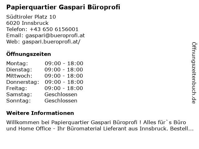 2 büroprofi Moser Papier und Büro Ges. m.b.H. (Entfernung: 8,40 km) Oberer Stadtplatz 3, 6060 Hall in Tirol 5 Safe - Project Sicherheitstechnik & Projektmanagement GmbH (Entfernung: 2,27 km) Amraser-See-Straße 56, 6029 Innsbruck 6 |