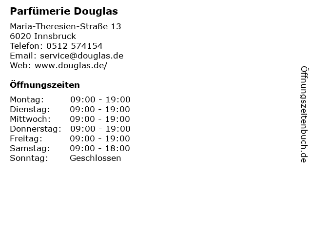 | Öffnungszeiten Parfümerie Douglas in Innsbruck anzeigen | |