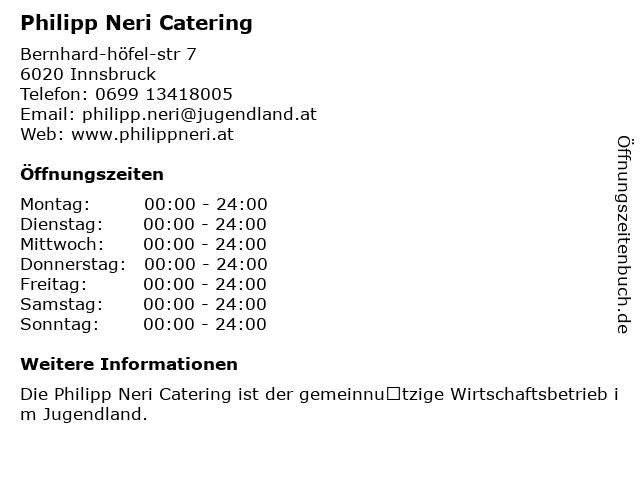 | Öffnungszeiten Philipp Neri Catering in Innsbruck anzeigen | |