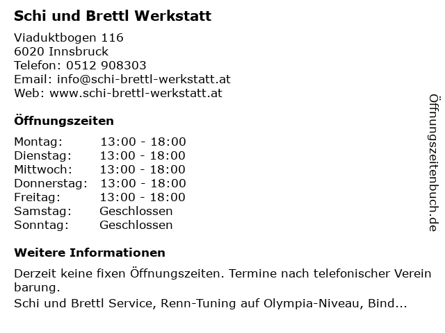 | Öffnungszeiten Schi und Brettl Werkstatt in Innsbruck anzeigen | |